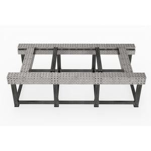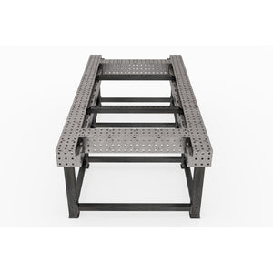 Each Chassis table features 2 "long rails" with 16mm holes on 2-inch centers throughout for use with standard clamps and accessories. The top surfaces are 6 inches wide and 3/8" thick which allows for setups and clamping of most frames. The long rails also feature a cross bar ledge that allows for infinite placement of the short cross rails. Once the short rails are bolted in this makes for an extremely rigid assembly. By using this configuration, virtually any frame can be accommodated.